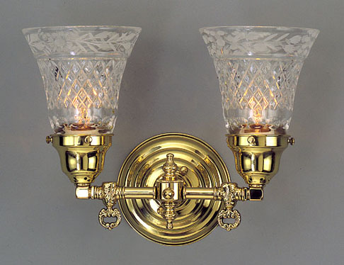 Here is a diamond cut glass shade dressing this lovely Colonial two light wall lamp. Custom width is fine. Perfect in pairs. See the next light for the single light version MODEL NS179.