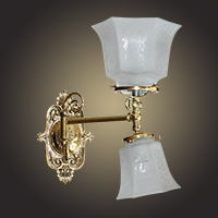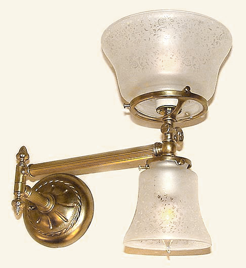 A lovely up and down gaslight 'swingarm' for mounting on either side of your master bed or even your spa or powder room. You can even tell us how long you'd like it! Very cool and VERY custom! Victorian at heart with faux key above the shade holder. Shown with beautiful etched glass which can be changed to a different shade of course. Mount it up or mount it down.