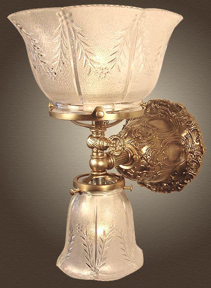 With an all solid cast brass construction, here's a lovely 'Up and Down' period authentic reproduction of a vintage gas light fixture. The stunning detail and historic accuracy of this fixture has made it one of our most popular models. Complete with realistic gas key, this model offers plenty of light and outstanding design! Pictured here with a lovely 4 inch fitter and matching 2 inch fitter "Wheat Glass".