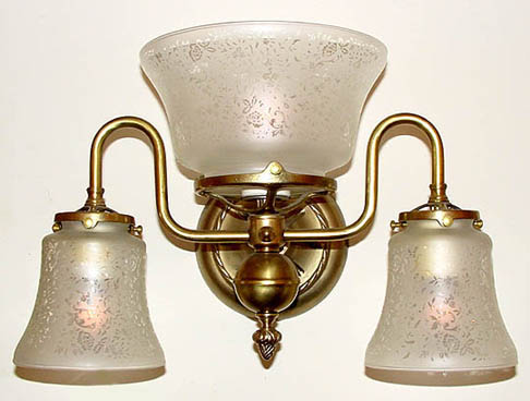 A gorgeous Colonial gas light reproduction shown with coordinated multi sized glass shades. Offers plenty of light for the powder room or as accent lighting fixtures for the dining room.