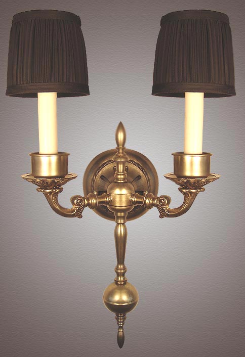 Very ornate and not for the weak at heart! A generous helping of 'Olde Colonial' hand craftsmanship. A beautiful candelabra wall light for your larger Powder room? Beside your fireplace? Solid brass construction and a petite black mushroom pleat fabric shades clip on to a candelabra base light bulb. Everything on this one makes the statement!