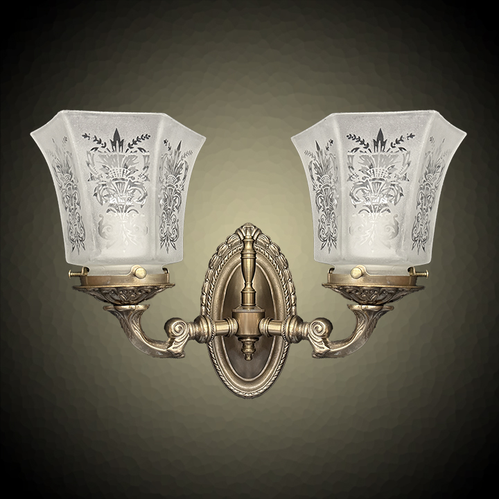 An interesting vintage gas light design, this two light wall sconce offers plenty of light and a lovely feel. Solid cast brass construction hexagonal French acid etched glass globe. An added cast brass bobeche (plate) under each of the glass shade holders adds depth. Mount it up or mount it down.