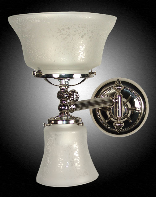 Like all of our lighting fixtures, nickel and other metal colors are always available. Add an optional swivel above the lower shade holder for directional lighting! Acid etched French glass and faux gas key really finishes the authentic period accuracy.